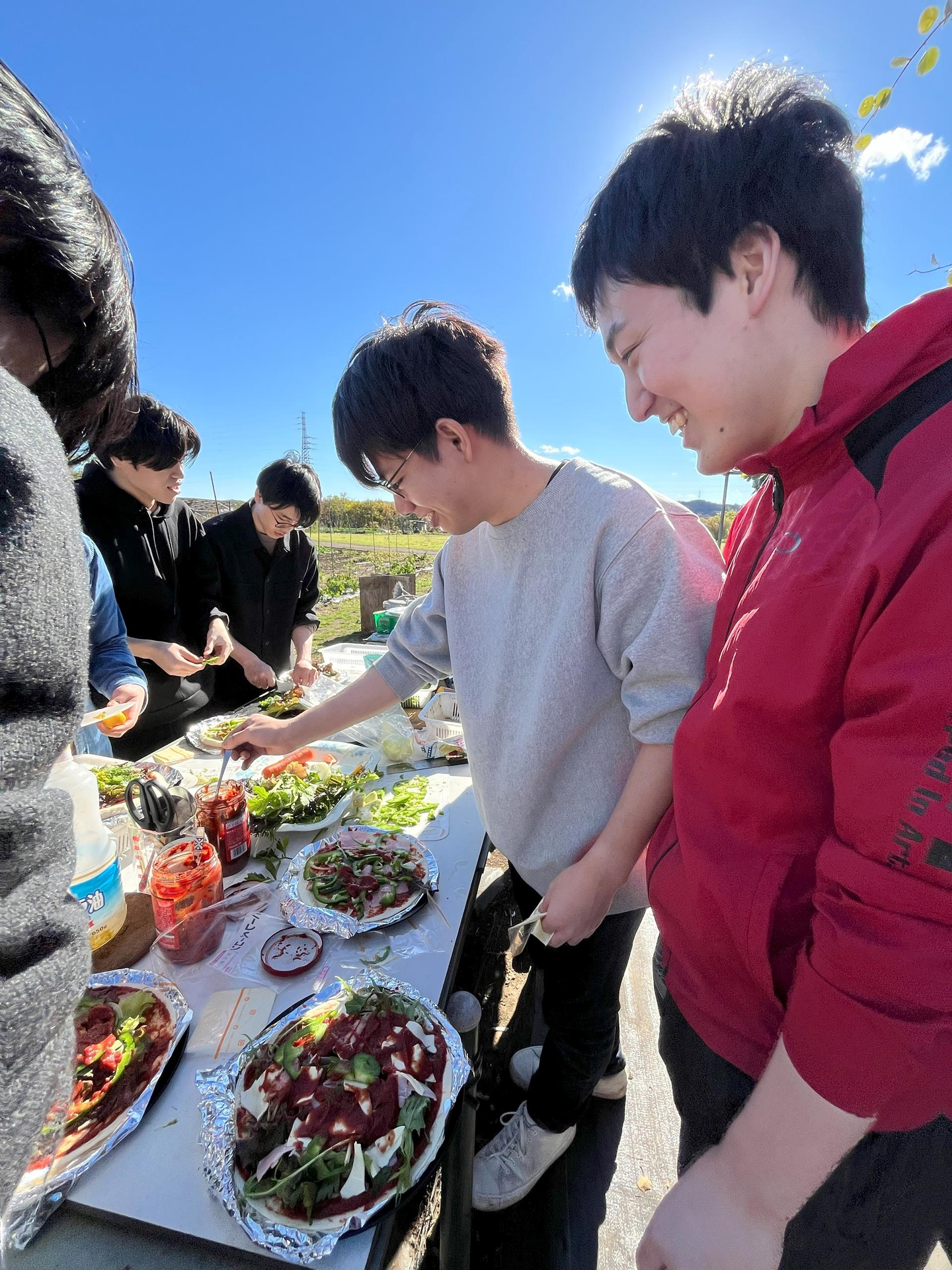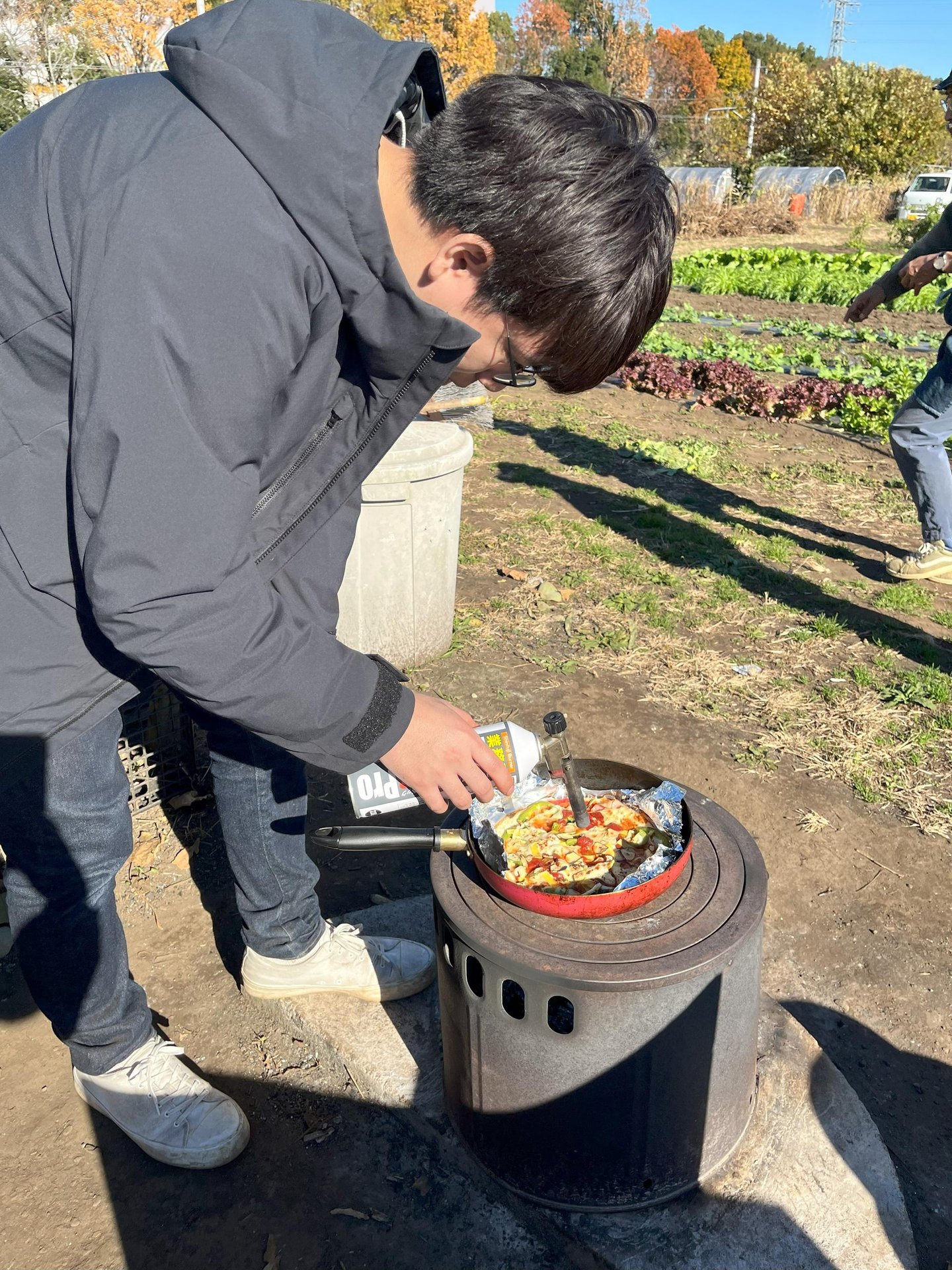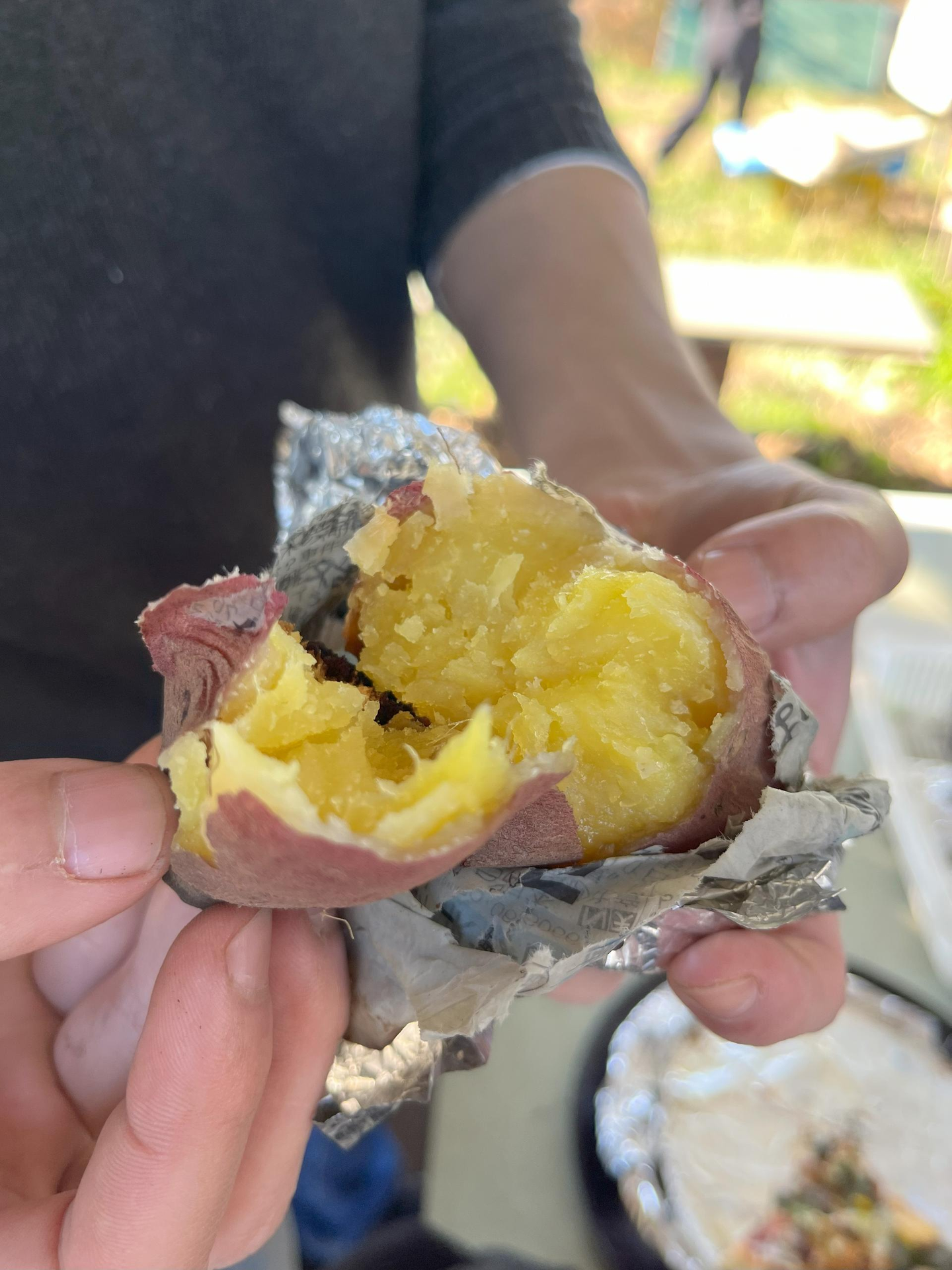 昼食は農園野菜を収穫させていただき、ピザと焼き芋を作りました。一人ひとりがオリジナルのトッピングを楽しみ、MYピザを作っていました。朝にセットしておいたさつまいもは、ホクホクに焼けて絶品でした!