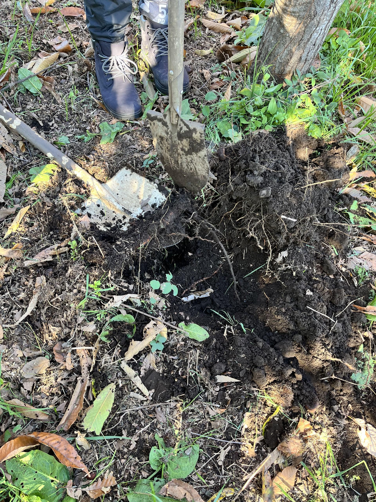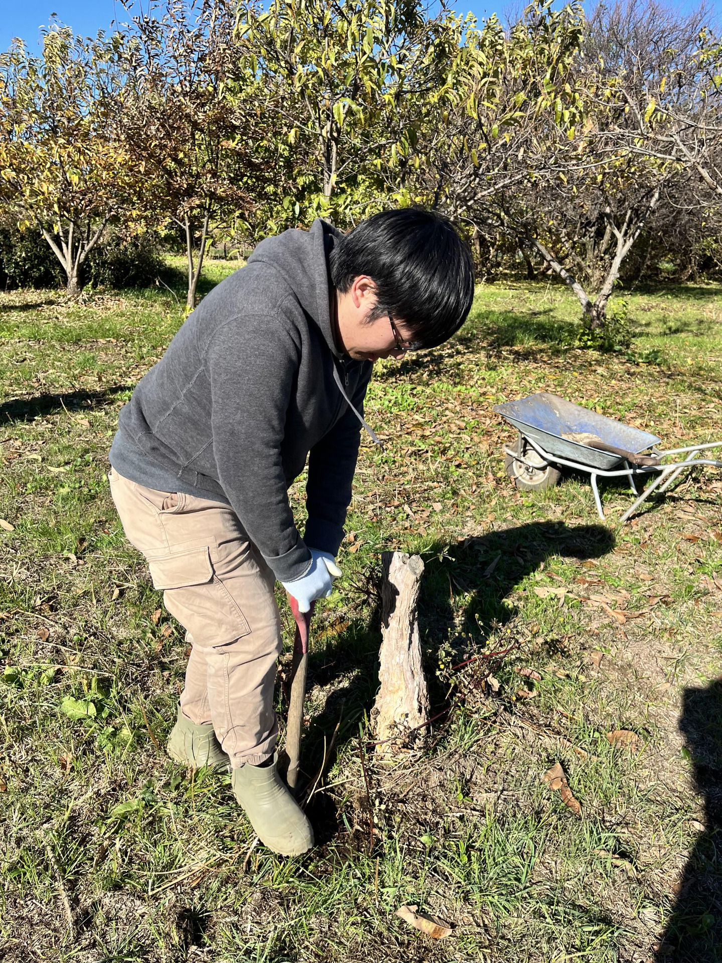 古い栗木の傍に新しい苗を植えるための穴を掘りました。殆ど枯れている木であっても、地中には力強く根が張っており、シャベルで掘ることができない場所もありました。(自然の力強さを感じました!)苗木の植樹は致しませんでしたが、将来大きな栗木が成るのが楽しみです。