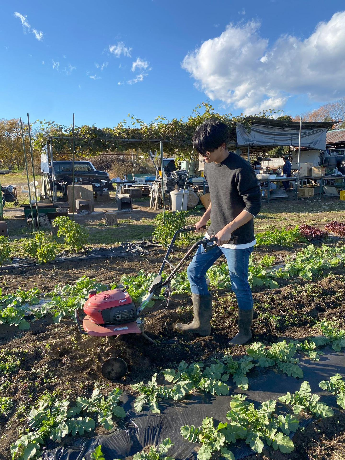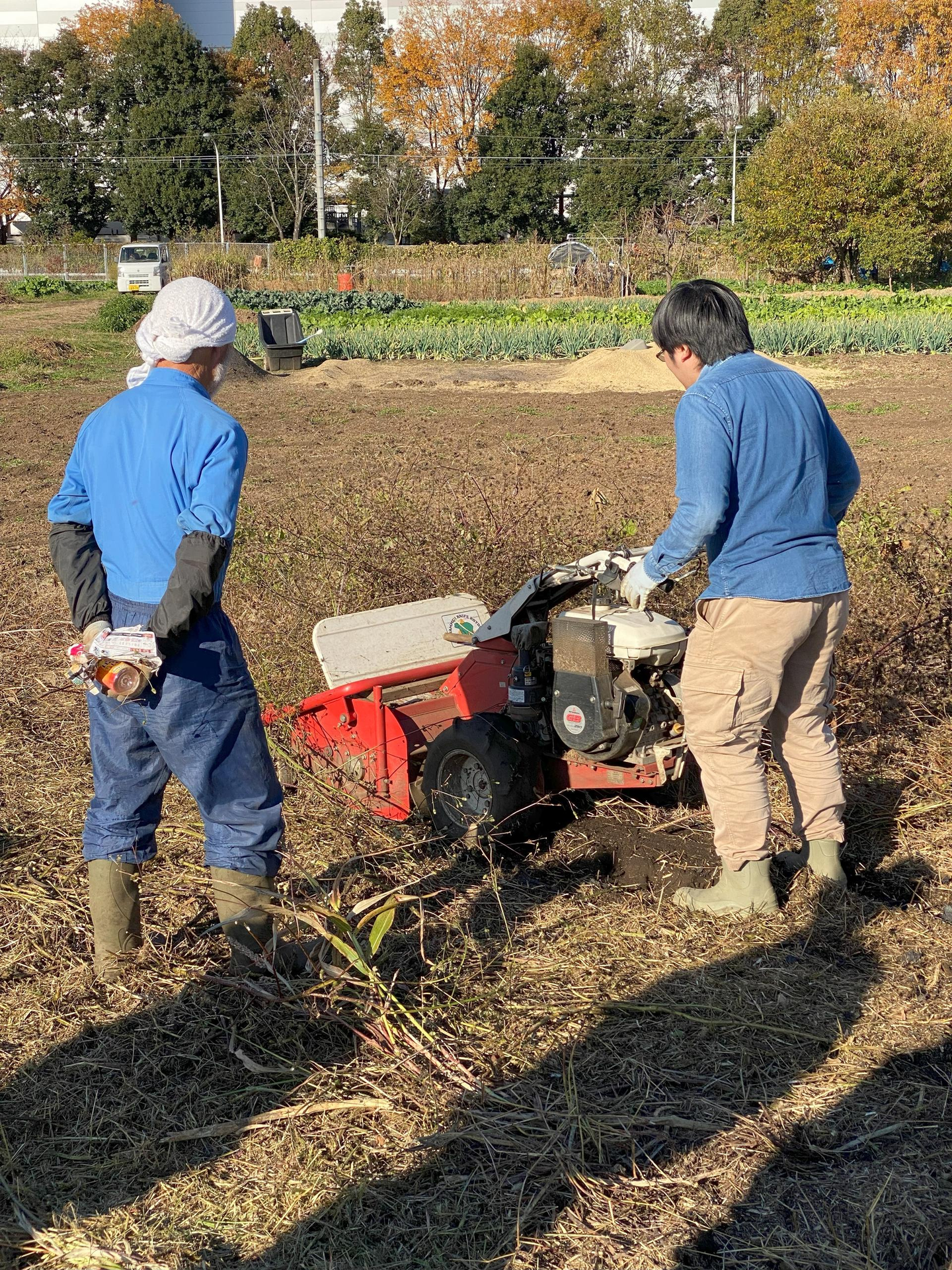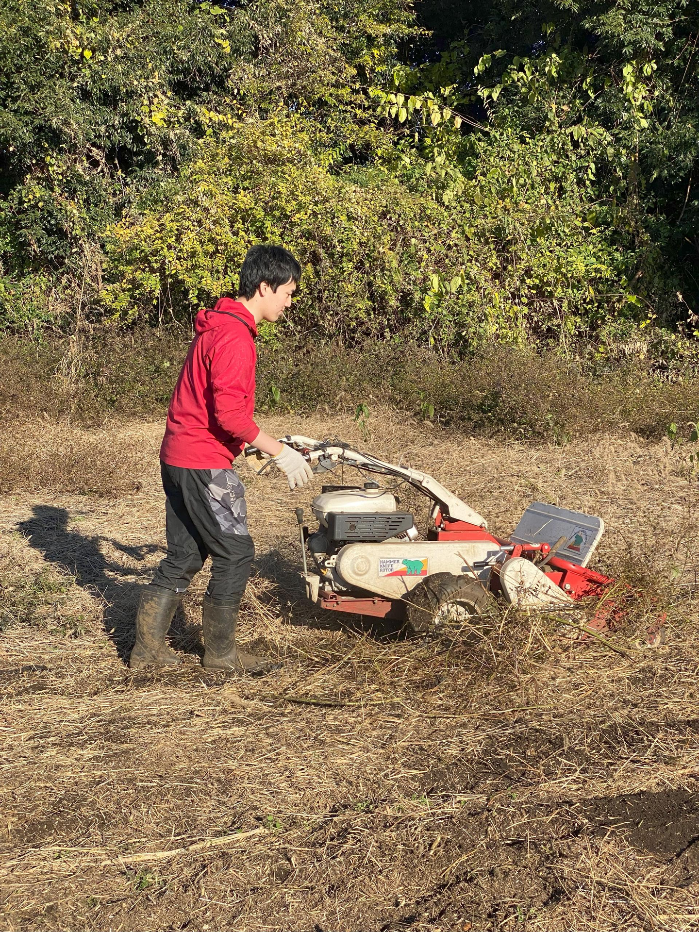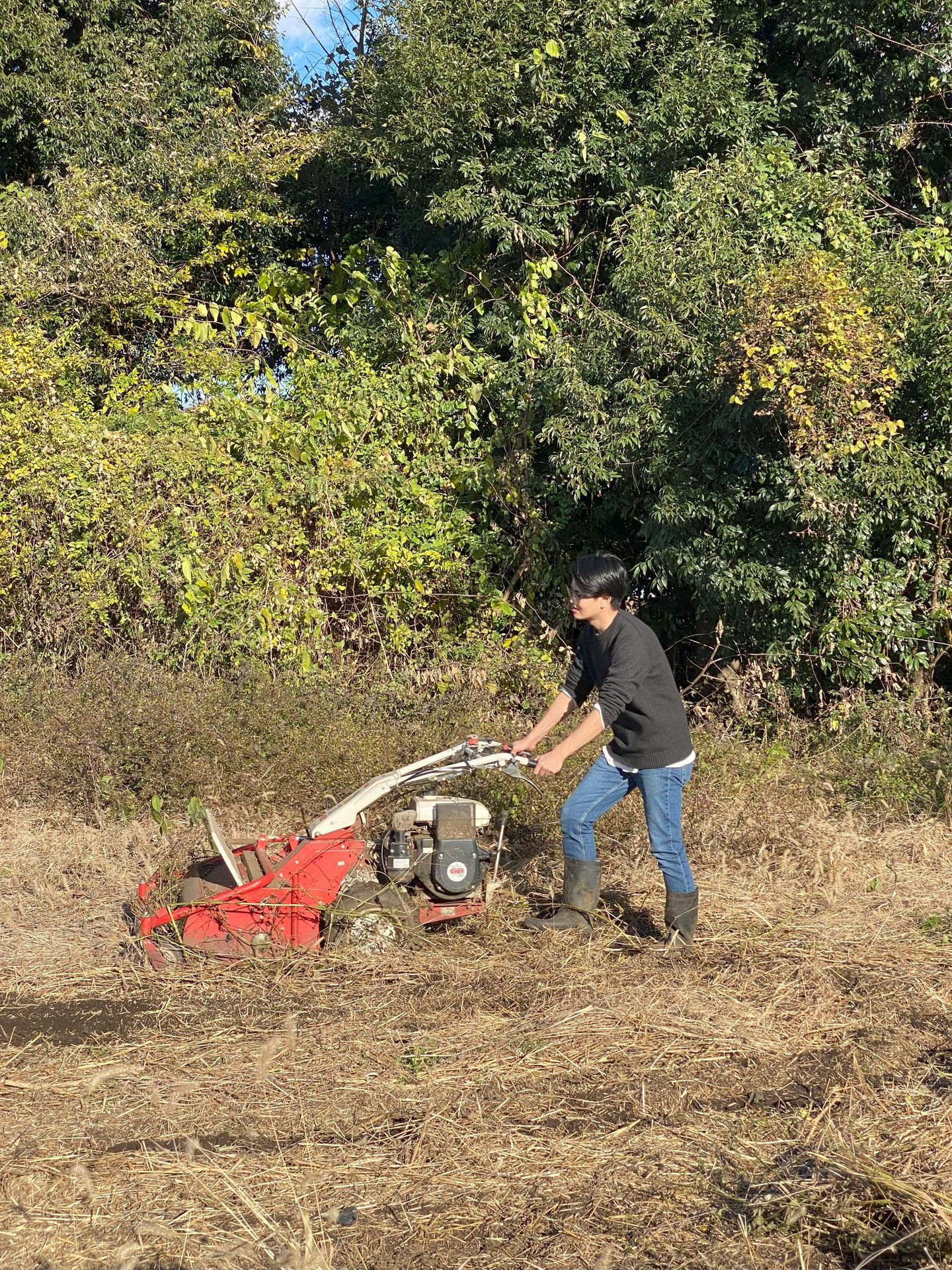 畑の健康を保つために、余分な草を取り除き土壌を掘り起こす作業を行いました。初めて農業機械を持ってみると、身体にエンジンの振動が伝わり、真っすぐに進むことが難しかったです。普段触ることのない耕運機や業務用の芝刈り機を使って、貴重な体験ができたことに感動していた社員もいました。