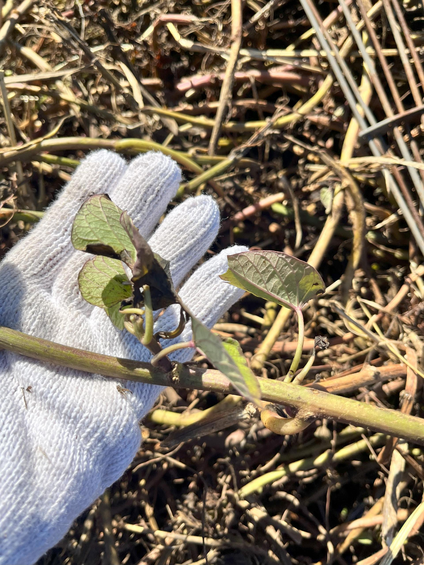 収穫後のさつまいも畑には大量の蔓が残っていました。太い蔓は畑を耕すためのロータリー(トラクター)に引っかかってしまうため、回収する必要があります。この蔓、トゲのように尖っている部分があるのか、軍手をはめていても触ると痛いのです・・・熊手をお借りし、足腰を使って回収しました。