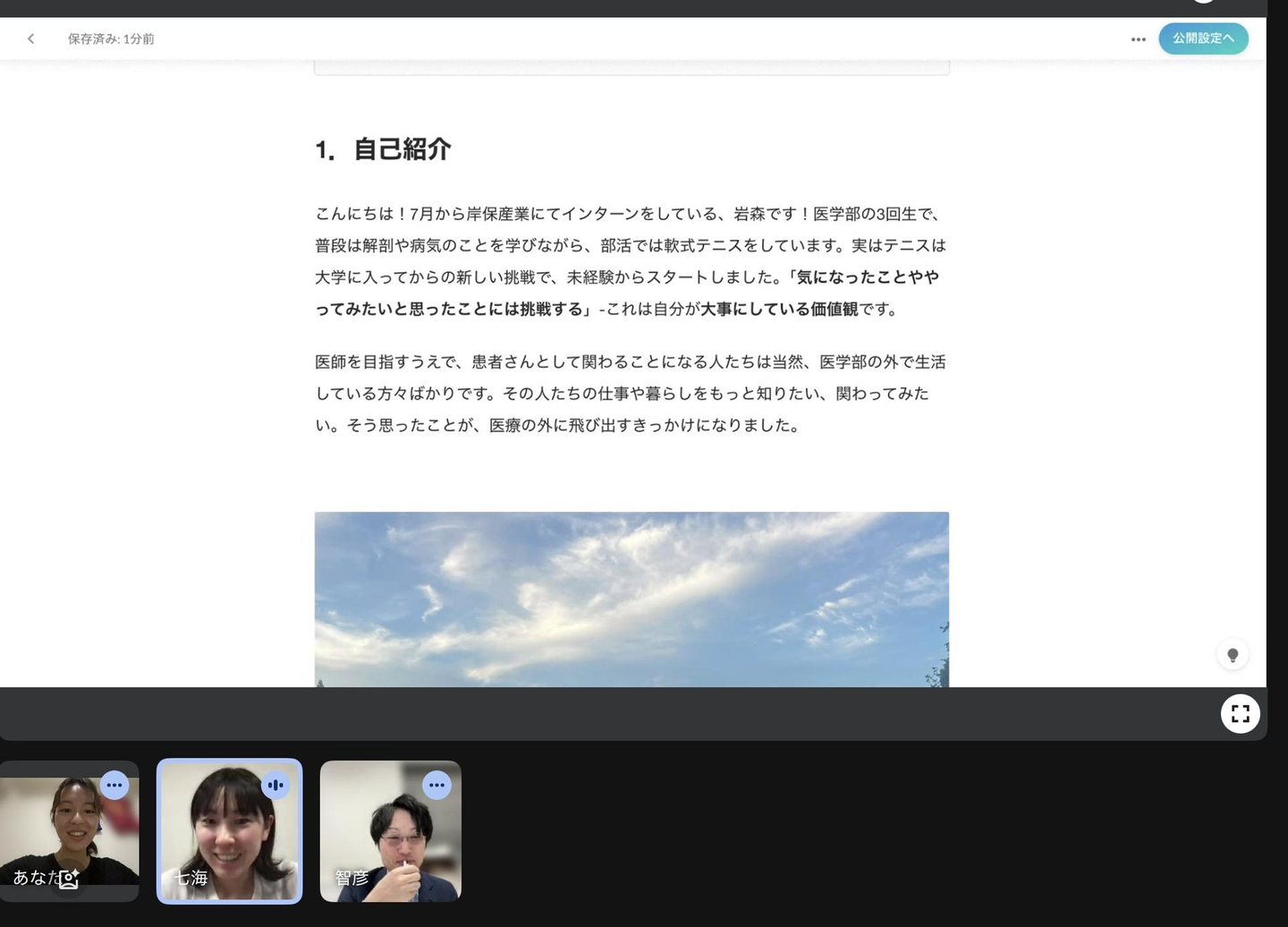 私自身、医学生という異分野から挑戦してみて、多くの学びを得られましたし、これからもインターン業務を通して成長していくつもりです。