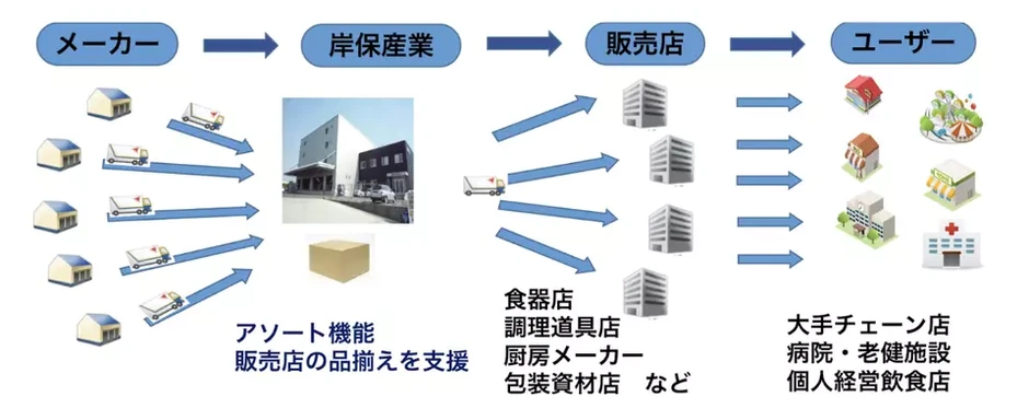 岸保産業は、メーカーから商品を仕入れ、それをオリジナルのカタログにまとめて小売業者に販売する会社です。自社で製造は行わず、さまざまなメーカーの商品を取り扱っています。