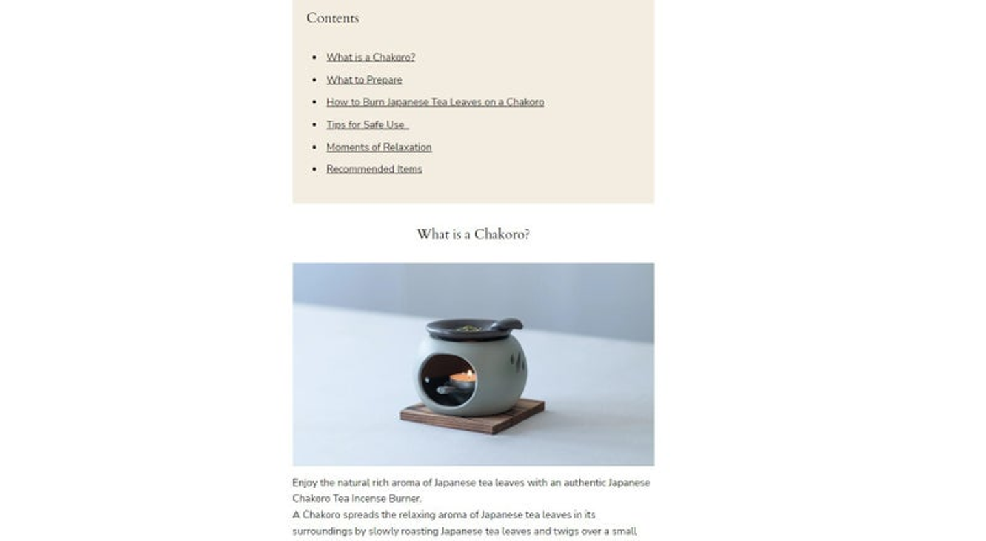 梅原「はい、選んだ商品はただ販売するだけではなく、魅力のあるコンテンツとともに紹介するようにしています。海外のお客様にとっては馴染みがない商品、使い方が難しい商品などは特にそうですね。例えば、茶香炉などは使い方を説明する必要がありますし、子供用の漆器などの良さも、実際にスタッフのお子さんが使ってみた感想などを記事にしています。コンテンツ制作はお客様へのメッセージだと考えています。」