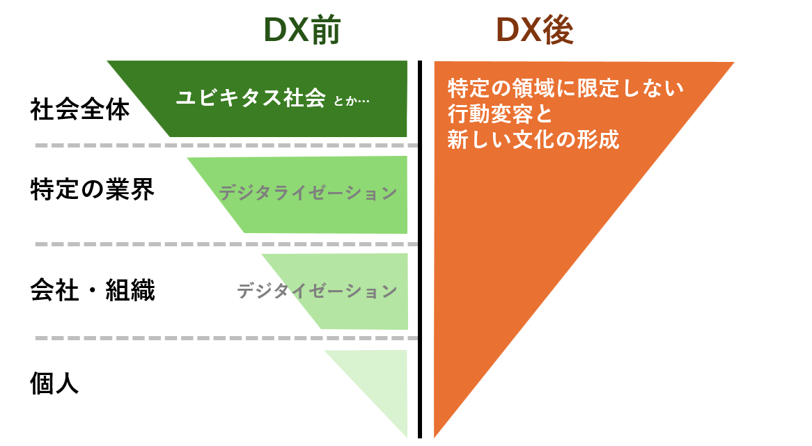 つまり、「○○のサービスを使うようになって、社内事務が電子化された」とか「チャットボットで簡単なQAができる」「生成AIで画像が作れる」などということでは無いようです。私たちシステムエンジニアが「DX」という時はもっと大きな世界でものを見る必要があるようです👀