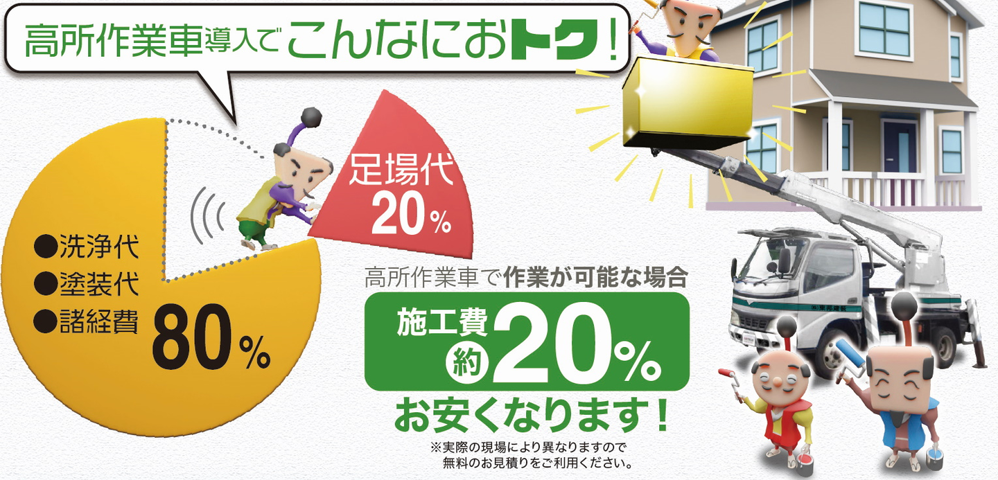 そこで、東邦建装は『高所作業車』を導入するというアイデアでこの問題を解決。足場の代わりに高所作業車を使用することで、足場代や足場を組む・解体する期間を大幅にカットすることができました!