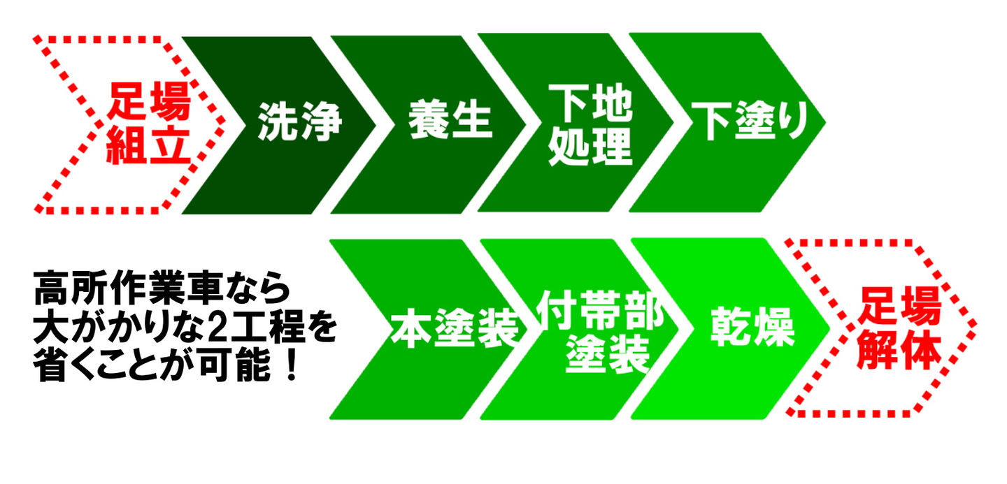 しかしながら、この『足場』がお客様に満足して頂けるサービスの足枷となっていました。つまり、足場を使用するということは、足場代や足場を組む・解体する期間が余計に必要となるのです。