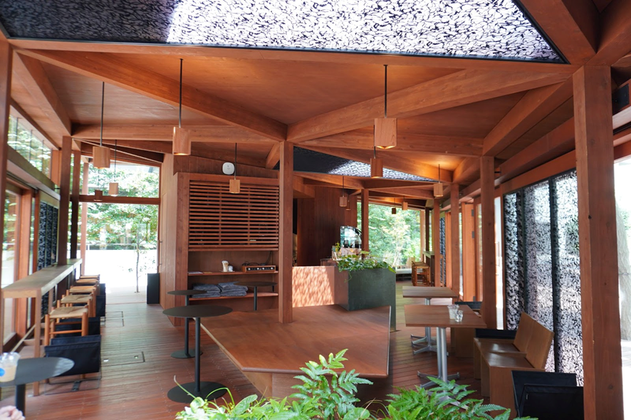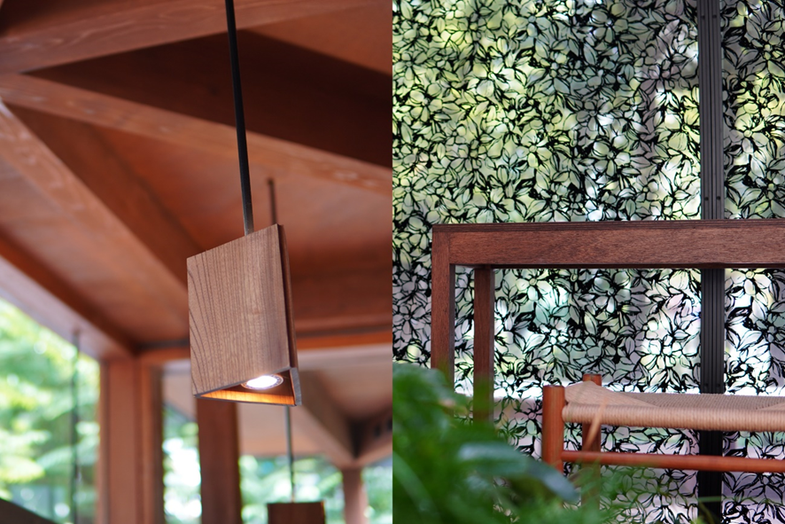 ▲葉の模様を施した網戸や、既存の樹木を活用して制作したペンダント照明など、内装にも工夫を凝らした唯一無二のカフェです。