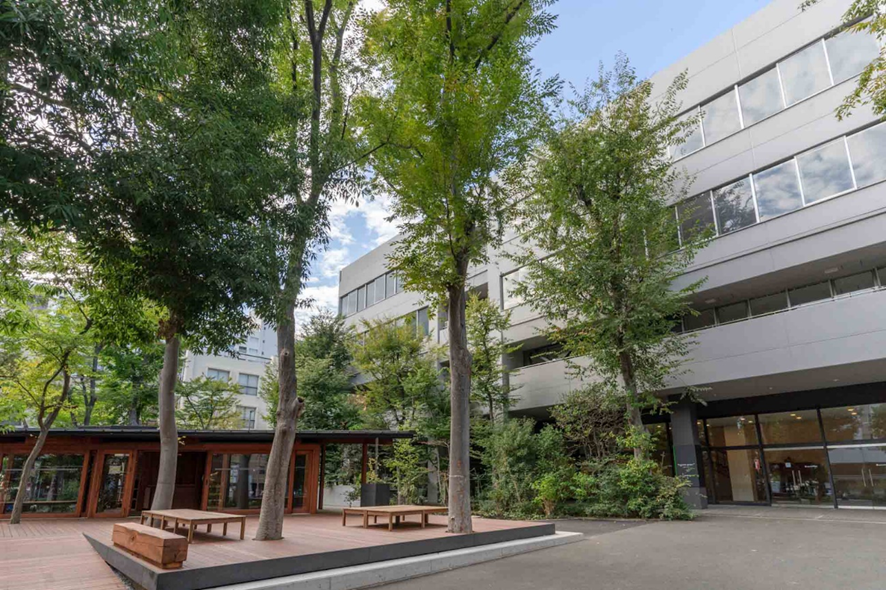 ▲建物の前面には美しい緑地空間が広がり、オフィス街にいながら、まるで木立の中で働いているかのような気持ち良さを感じられます。