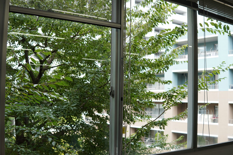 ▲執務室の大きな窓からは、中庭の木々が見渡せます。建物の中にいても、豊かな緑を感じられますね。