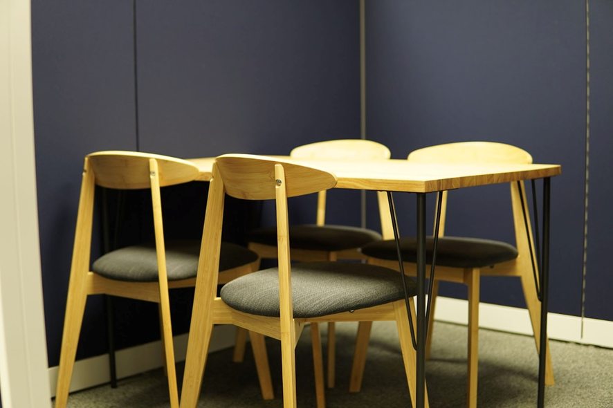 ▲執務室の一角は「1on1ブース」になっています。社員同士のコミュニケーションを促す工夫が、こんなところにも垣間見えますね。