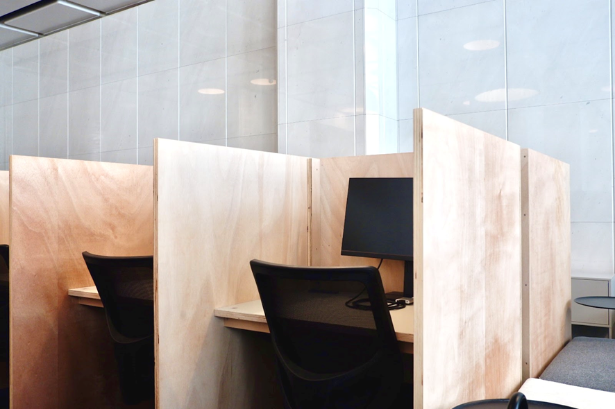 ▲ラウンジ内のソロワークスペースは、程よい「おこもり感」があり、一人で黙々と集中したいときにぴったり。モニターが設置された席もあるのも、嬉しいポイントです。