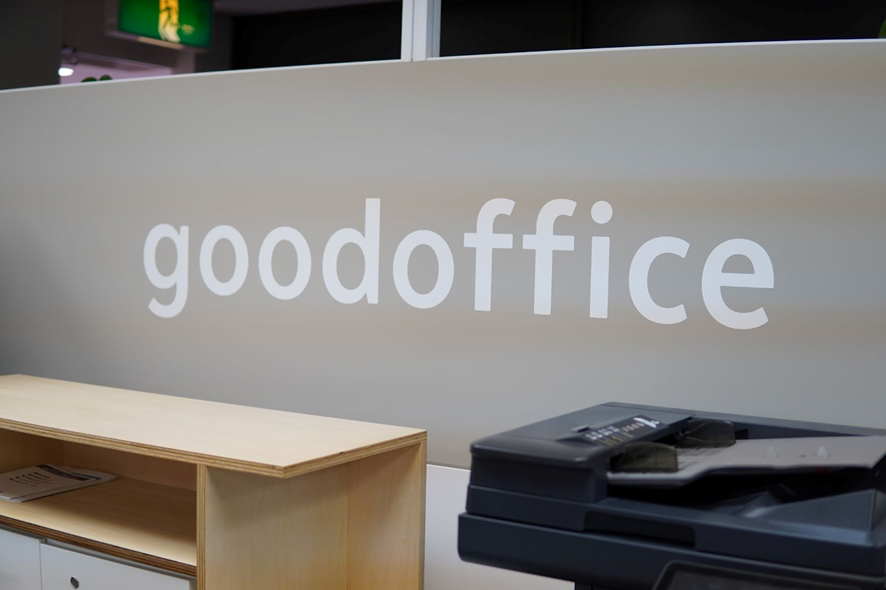 ▲執務室の入り口では、大きなグッドオフィスのロゴが社員をお出迎えします。