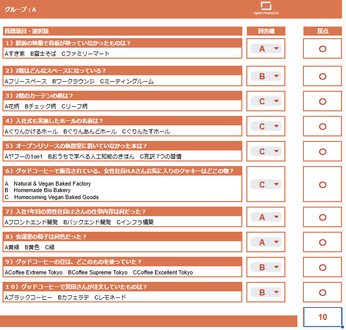 クイズは全部で10問、ヒントは一切なし、動画を再生できるのは1回だけ、というなかなか難易度の高いルールで実施したのですが、なんとAグループは全問正解という快挙を成し遂げました!