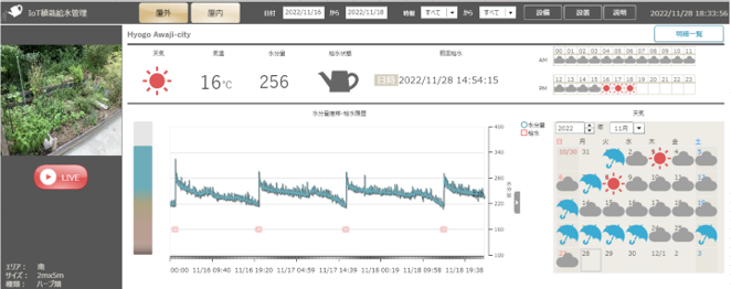 土の水分量を測定して、乾いたら自動で水やりをするシステムを畑に構築しているんです。この実験のトライ&エラーを活かして、造園業界のクライアントに問題解決の提案を行っています。具体的には、オフィスビルの観葉植物の管理に同じシステムを採用してはどうかと。ビルの水道管にシステムを取り付けるだけなので、給水タンクを新たに設置する必要もありません。遠隔地であってもリアルタイムで植物の状態をモニタリングすることもできます。