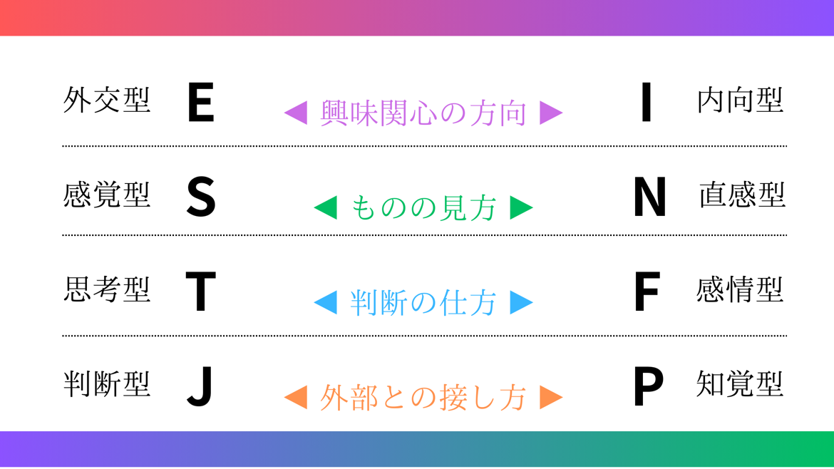 「外向型(E)と内向型(I)」「感覚型(S)と直観型(N)」「思考型(T)と感情型(F)」「判断型(J)と知覚型(P)」の4つの要素から、それぞれのアルファベットの頭文字を組み合わせて表現されます。