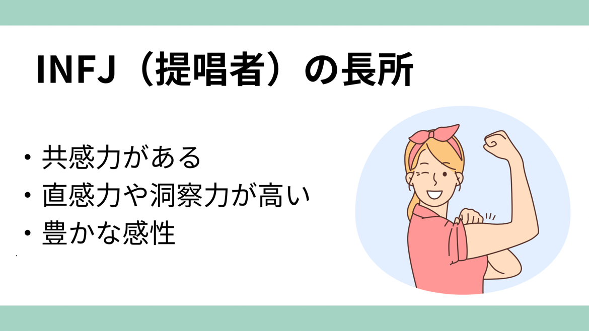 洞察力に優れ感性が豊かなINFJは、情報感度が高く「何を求められているのか」を察知する能力が高いのが強みです。