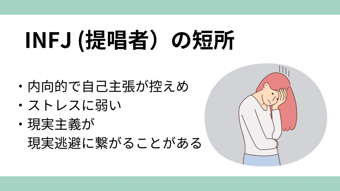 提唱者タイプは、理想に対する強いこだわりがあるため、現実的な妥協が必要な場面でフラストレーションを感じることがあります。また、理想に対するこだわりが強すぎて、職場や職種選びで現実的な選択肢を見失うこともあるため、バランスを取ることが必要です。