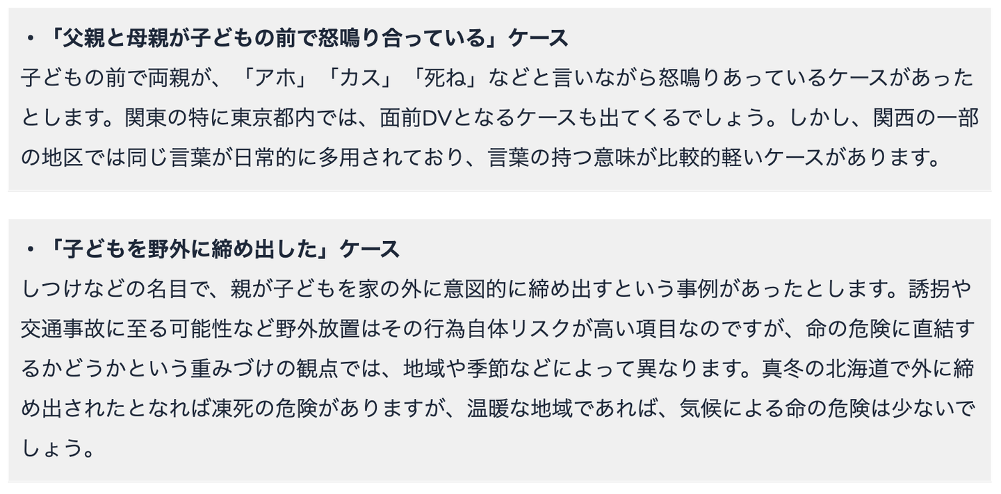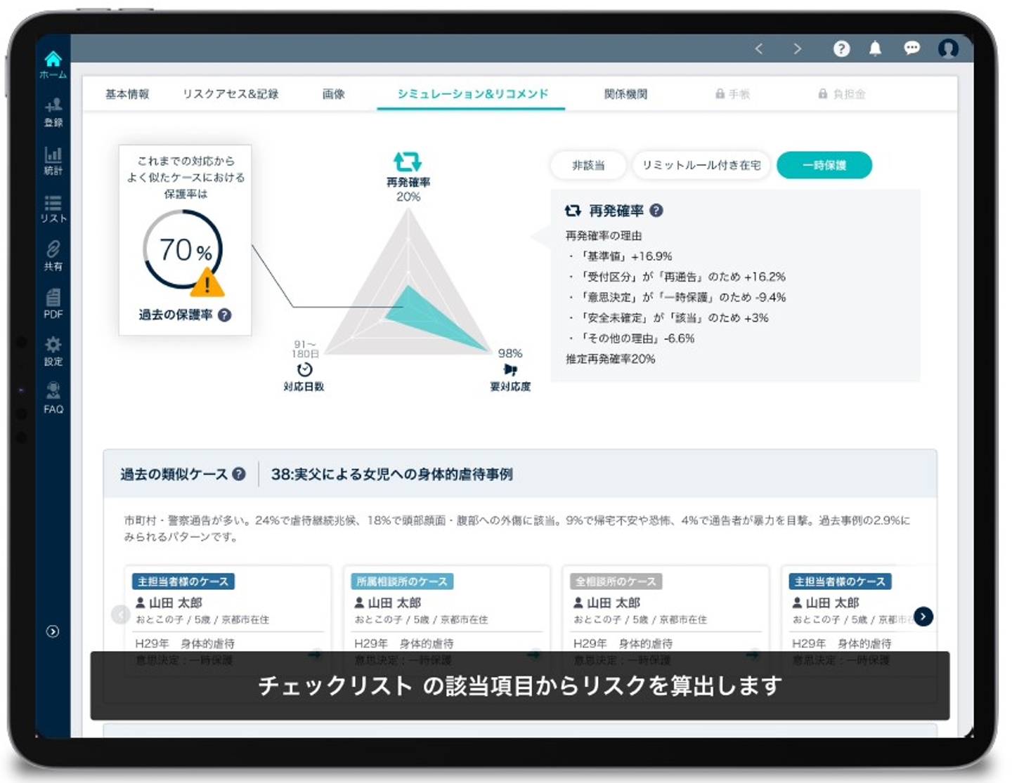 児童虐待領域で言えば、一時保護所で保護する可能性もありますし、保護所の空きがないため、あるいは重篤度が低いと判断したために在宅になる可能性もあります。また、近隣親族の方と良好な関係が築けており、何かあったら逃げ出して守ってもらえるという追加情報があれば、在宅にするといった判断もあるかもしれません。AIのインプットに含まれていない情報や使える資源を踏まえて、総合的に判断していきます。