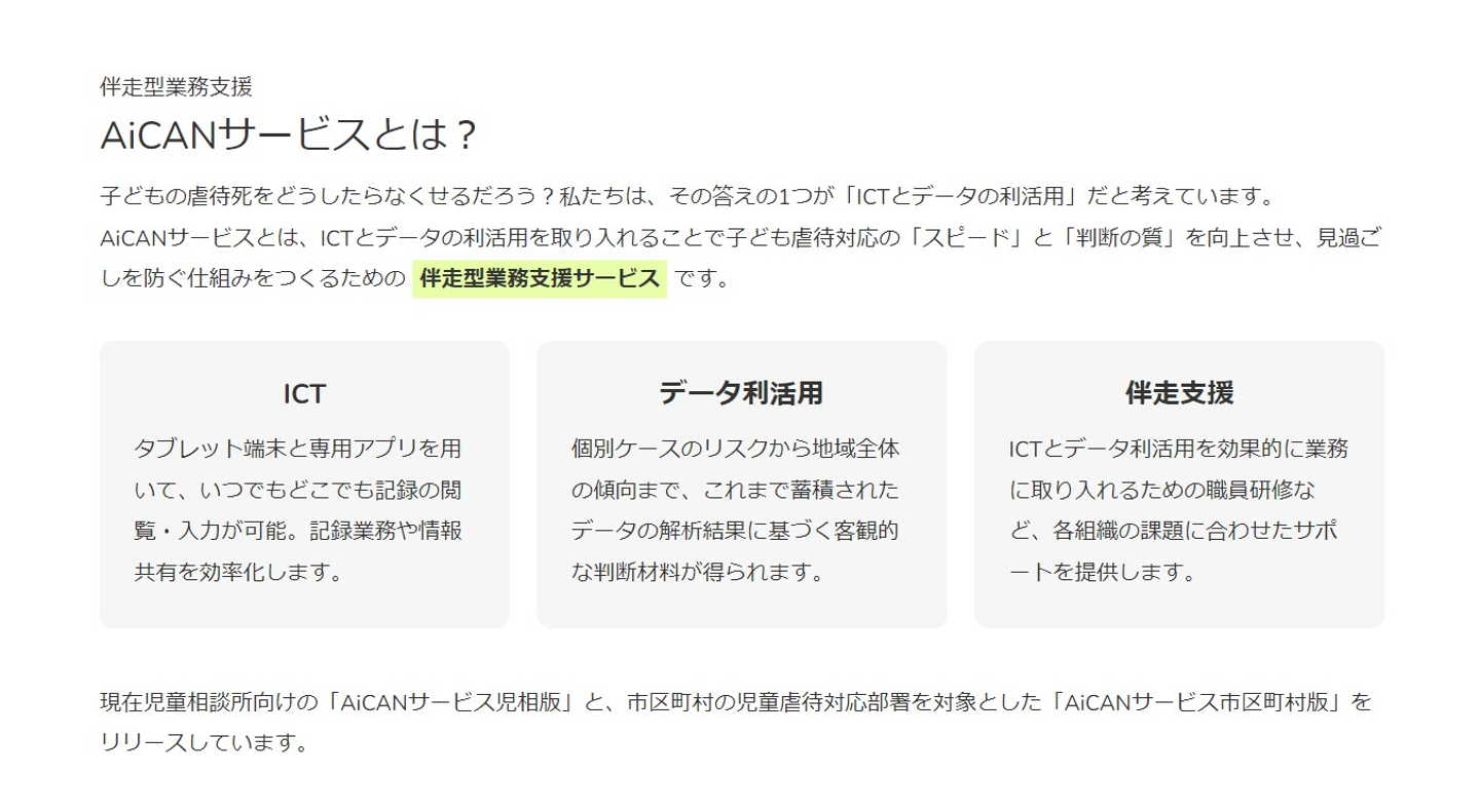 わたしたちは「すべての子どもたちが安全な世界へ変える」というビジョンを掲げ、子ども虐待の見過ごしをゼロにするべく、児童相談所のICT基盤を支えるプラットフォーム「AiCAN」を開発しています。AiCANは、自治体の虐待対応の現場でタブレット用Webアプリを活用していただき、業務を支援するサービスです。