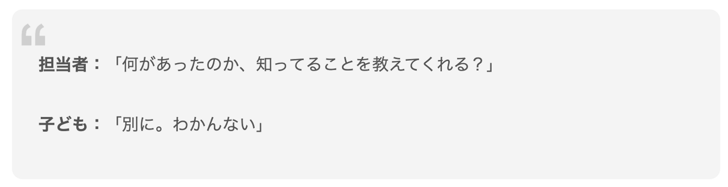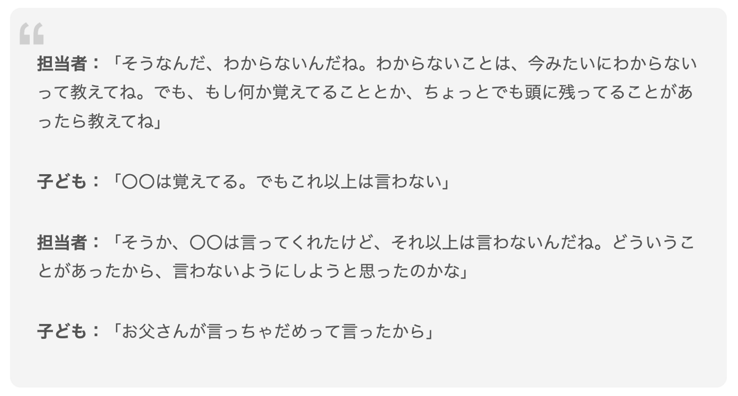 調査・聴き取りについても同様です。「子どもがしゃべらない」という状況でも、聞き方を変えると答えが変わってきます。例えば、虐待を受けた可能性のある子どもと以下のような会話をしたとします。