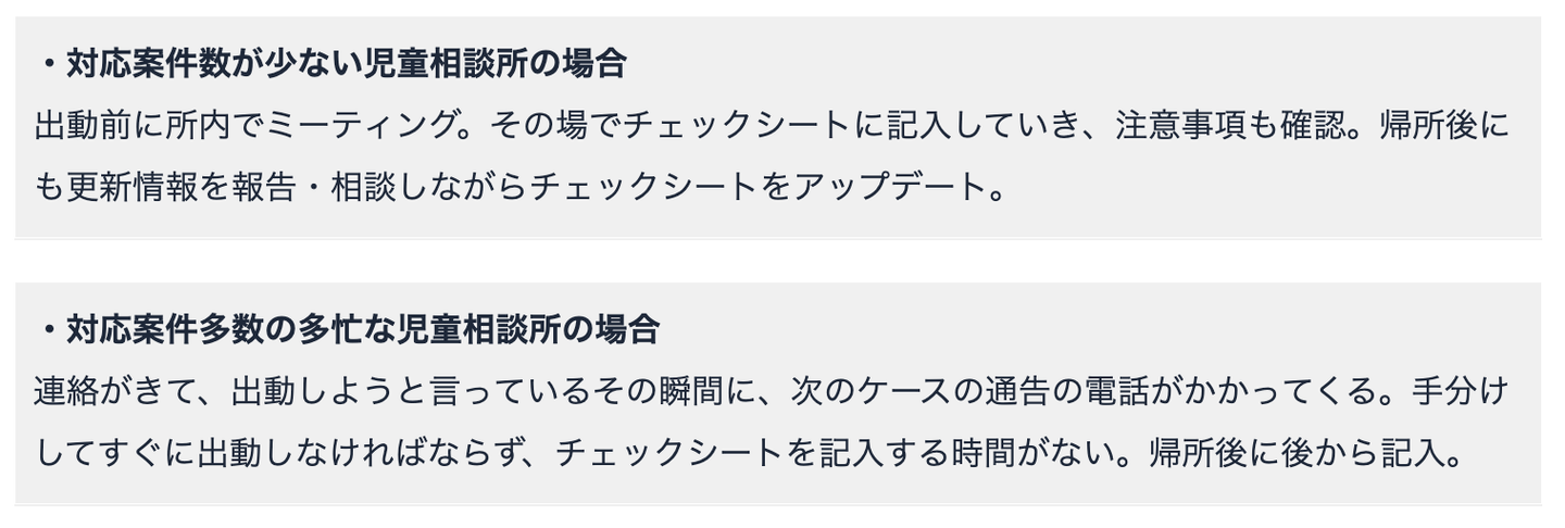 また、同じ児童相談業務でも、「データをいつ取れるのか」というタイミングも重要です。例えば、緊急連絡が来て「出動しよう」という判断になったとします。