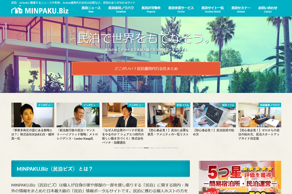MINPAKU.Bizは、民泊業界の最新情報から法規制、民泊を支援するサービス、世界の民泊仲介プラットフォームにいたるまで、民泊に関するあらゆる情報をまとめたポータルメディアです。
