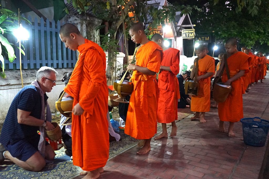 たとえば、ラオスの観光名物のひとつに、早朝僧侶にお米やお菓子の施しをする托鉢(たくはつ)があります。僧侶たちは食べきれない食料を貧しい子供たちへ分け与えます。