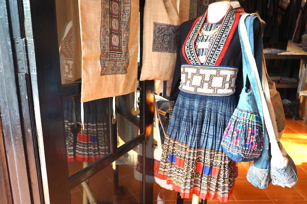 約50の民族がいると言われているラオス。町中やナイトマーケットでは、少数民族が作った服や小物が売られています。そんななか、一度使われた布をリサイクルして伝統的な服やラグマットなどに作り変え販売しているお店もありました。一つひとつ手作りのため、下記写真の衣装を作成するのに約1年かかるそうです。