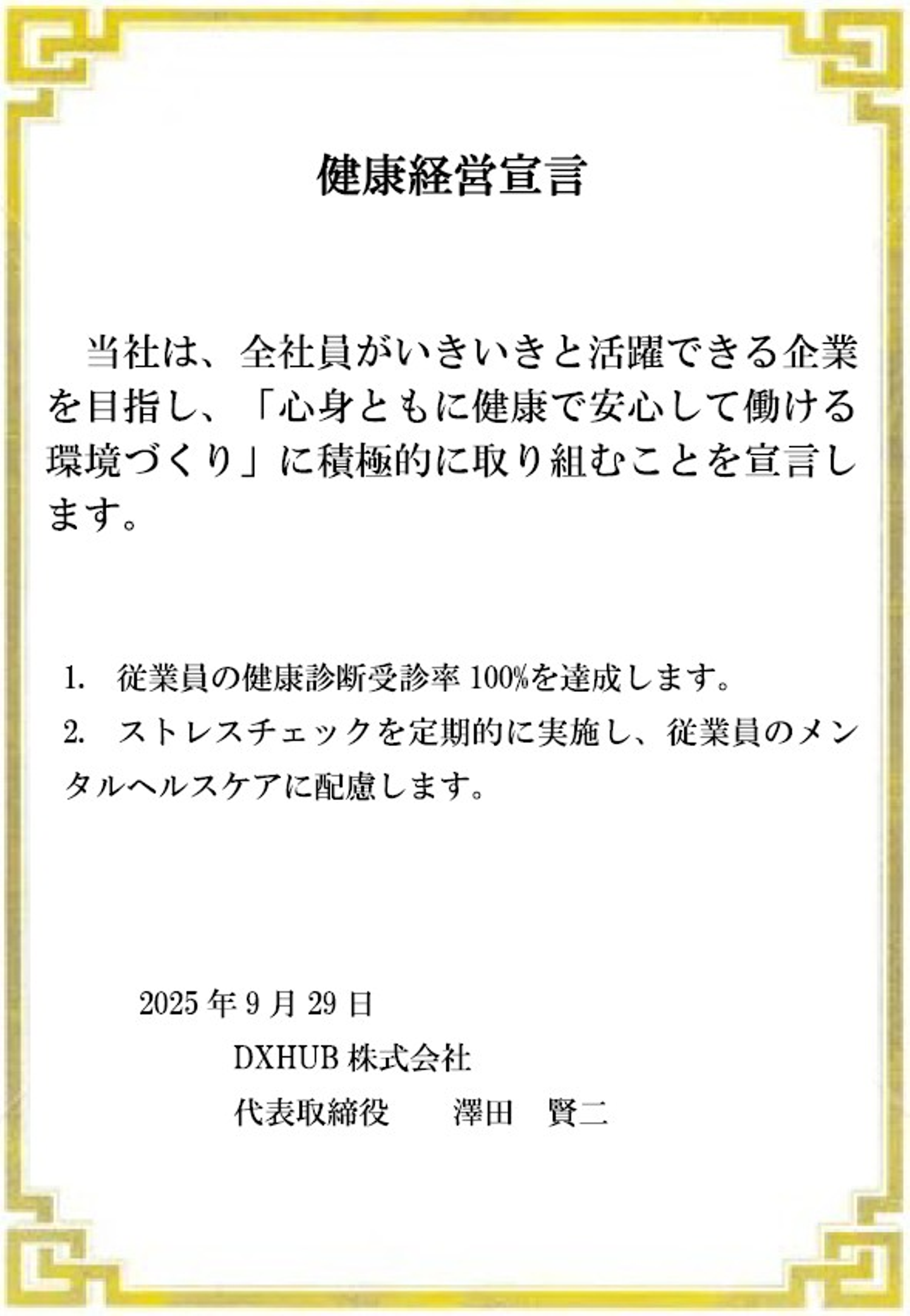 私たちDXHUB株式会社は「社員の健康を守り、安心して働ける環境をつくる」ことを経営の重要なテーマのひとつとし、ここに 健康経営を推進することを宣言します。