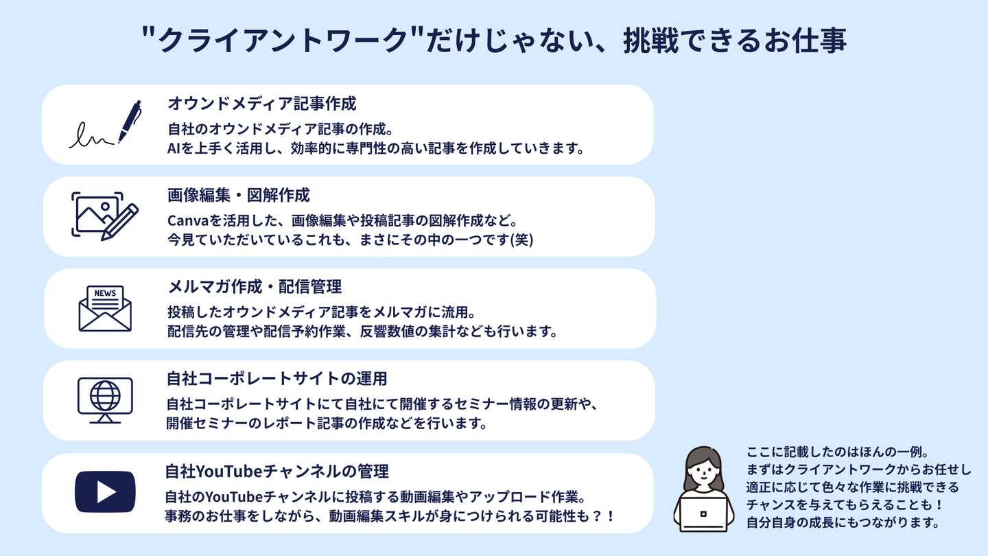 メインはクライアントワークですが、担当業務はそれだけにとどまらず、自社のコンテンツマーケティングに関わることもあります。一般的な事務職ではなかなか経験できないような業務を、適性に応じて任せてもらえる環境です。