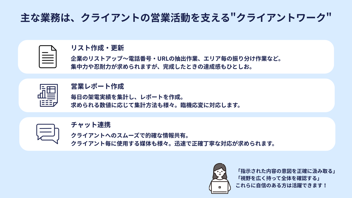 実際にネットで調べてみても、請求書作成やデータ入力、資料準備など、営業をサポートする役割として紹介されていることが多い印象です。