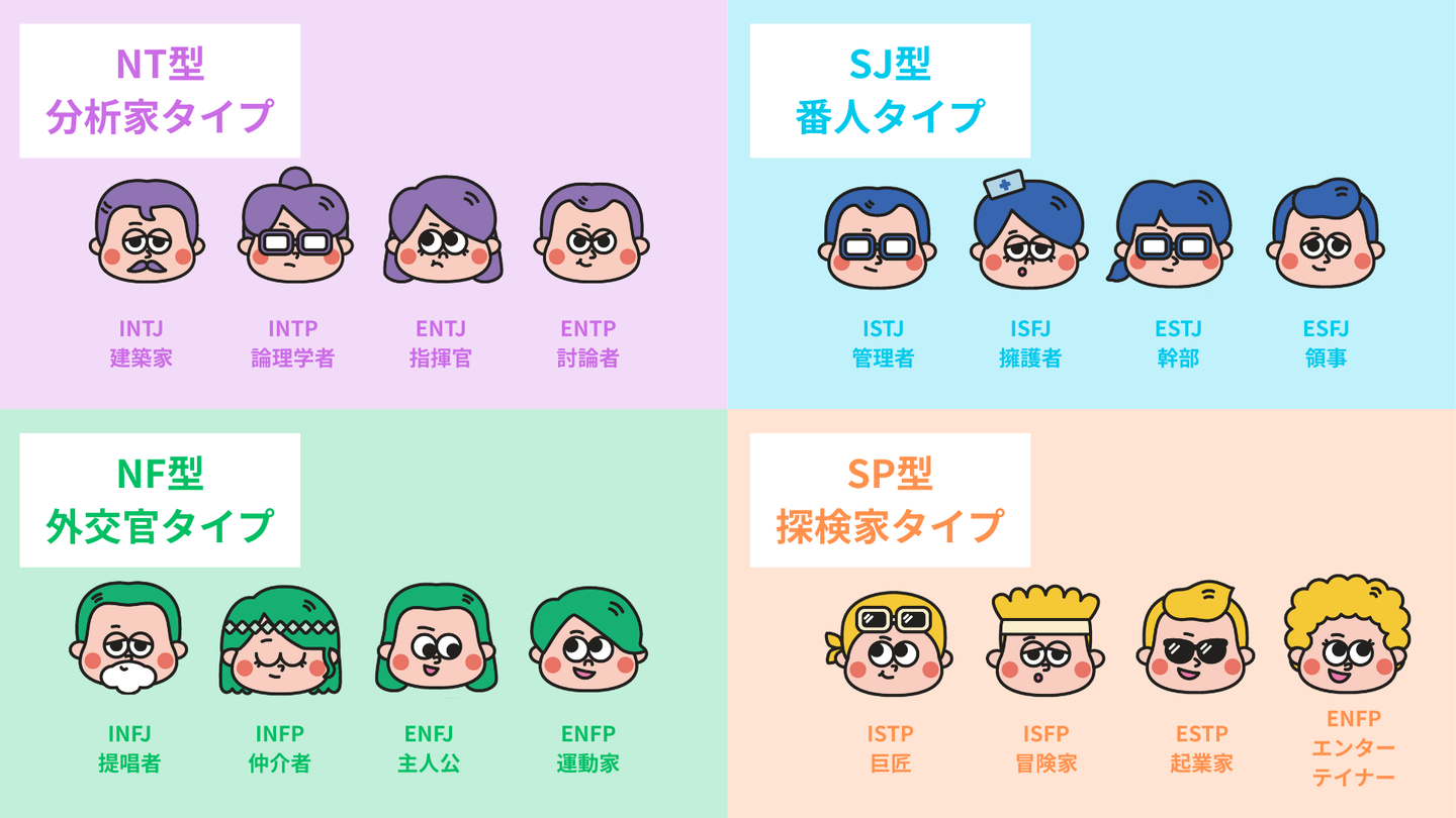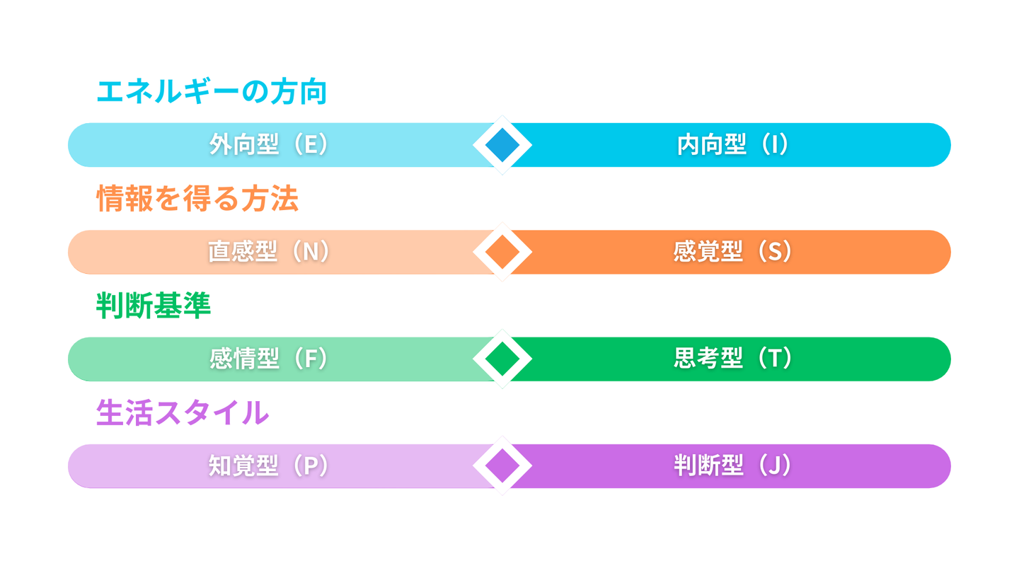 MBTIは、人の興味関心やものの見方、判断の仕方などから性格を16タイプに分類する診断ツールです。4つの指標を組み合わせることで、思考や行動のクセ、強みの傾向を知ることができます。