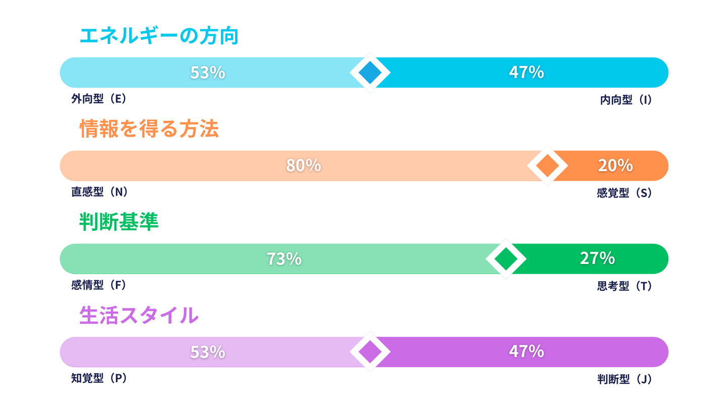 ここからは、MBTIを構成する4つの指標ごとに、アスレバ全体の傾向を見ていきましょう。数字で見ると、意外と「らしさ」がはっきりしてきます。