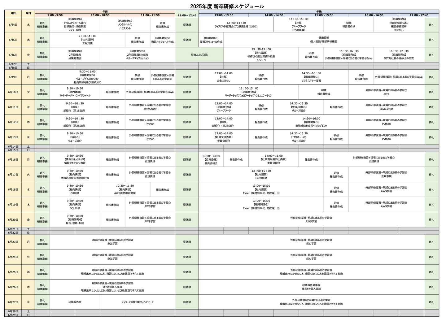 ・社長面談(順番に実施、スケジュール別紙)↓↓ 2025年度新卒の社内実践研修のスケジュールは以下のような内容でした。