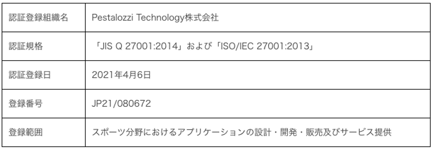 体力テストデジタル集計「ALPHA」(アルファ)や、オンラインコーチング「CoachX(コーチエックス)」を展開するPestalozzi Technology株式会社(本社:東京都新宿区、代表取締役:井上友綱、以下当社)は、2021年4月6日に情報セキュリティマネジメントシステム(ISMS)第三者認証基準である国内規格「JIS Q 27001:2014」および国際規格「ISO/IEC 27001:2013」を取得いたしました事をお知らせいたします。