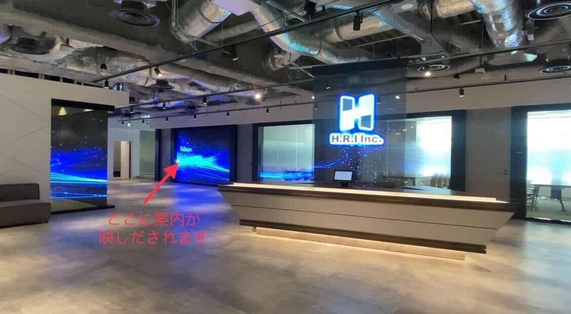 壁全体には常時映像が流れており、会社ロゴや会議室への案内表示が映し出されています。