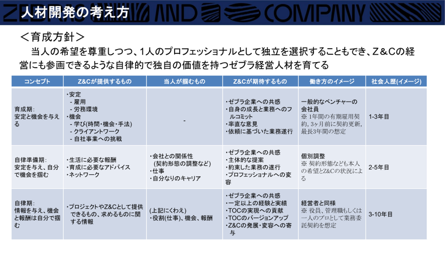 阿座上: Z&Cでは人材育成の方針をまとめているのですが、そのテーマがまさに「自律」となっています。大きくわけて3段階の成長ステップを設計していて、「育成期」は新卒や若手が対象。まずはZ&Cの中にある仕事をきちんと実行できるようになってもらいます。「自律準備期」は、Z&Cの仕事を受けつつ、成果の出し方や働き方を自分から提案するようになる。そして「自律期」は、独立して仕事ができるレベルで、仕事も自分でつくるし、給与も自分で交渉するようになってもらいます。