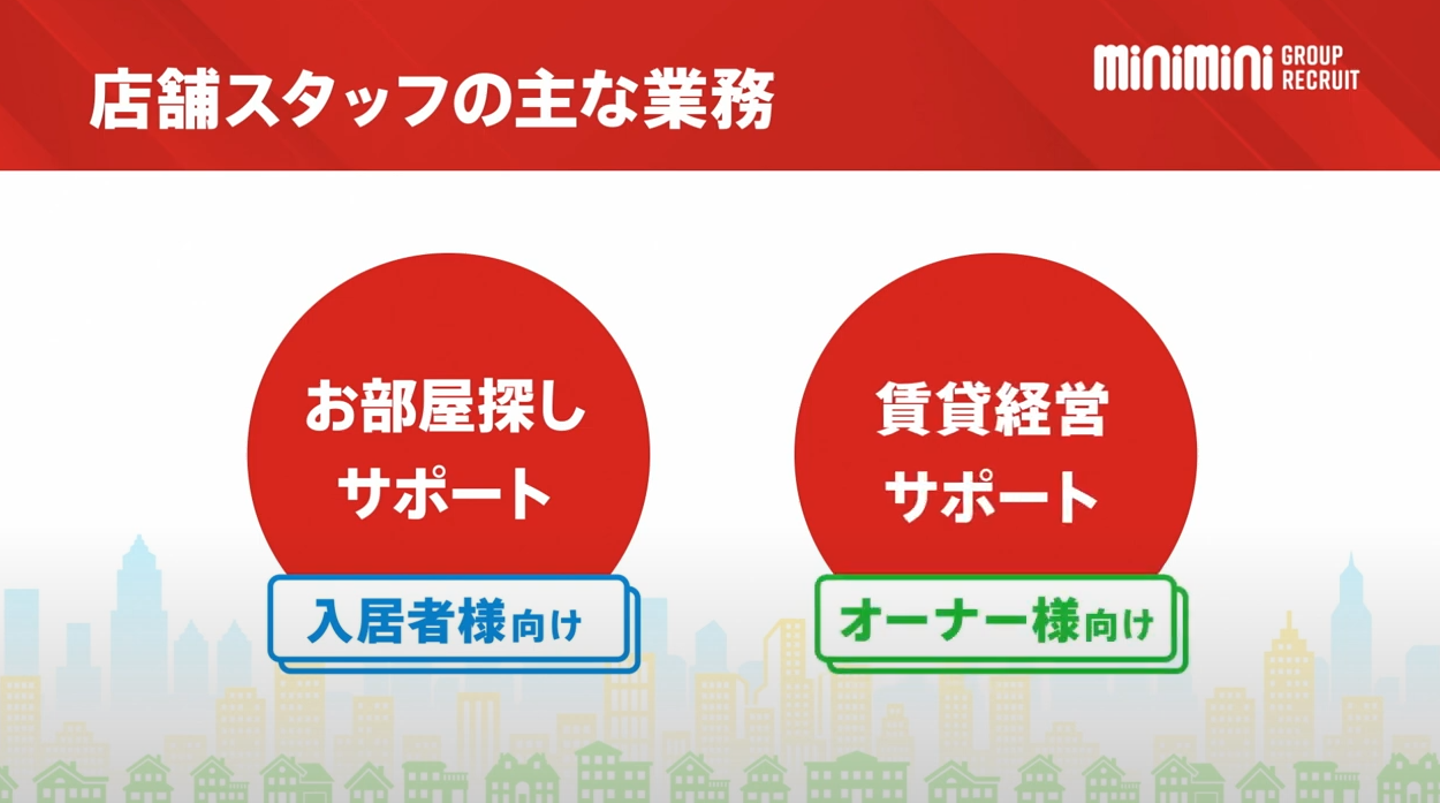 ルームアドバイザーは、賃貸物件仲介のスペシャリストとして、お部屋探しするお客様向けの営業スキルとオーナー様向けの営業スキルを身に着けることができる仕事です。