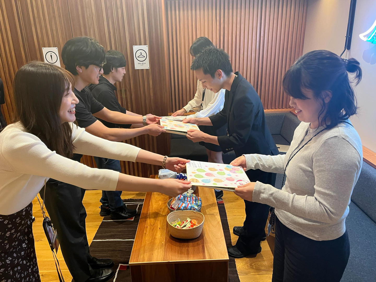 人事からは、メンターや周りの社員が寄せ書きした色紙をプレゼント。それぞれのメッセージには、日々の成長を見守ってきた温かい想いが込められていました。当社の手厚いメンター制度と、アットホームな人間関係を象徴する一幕です。