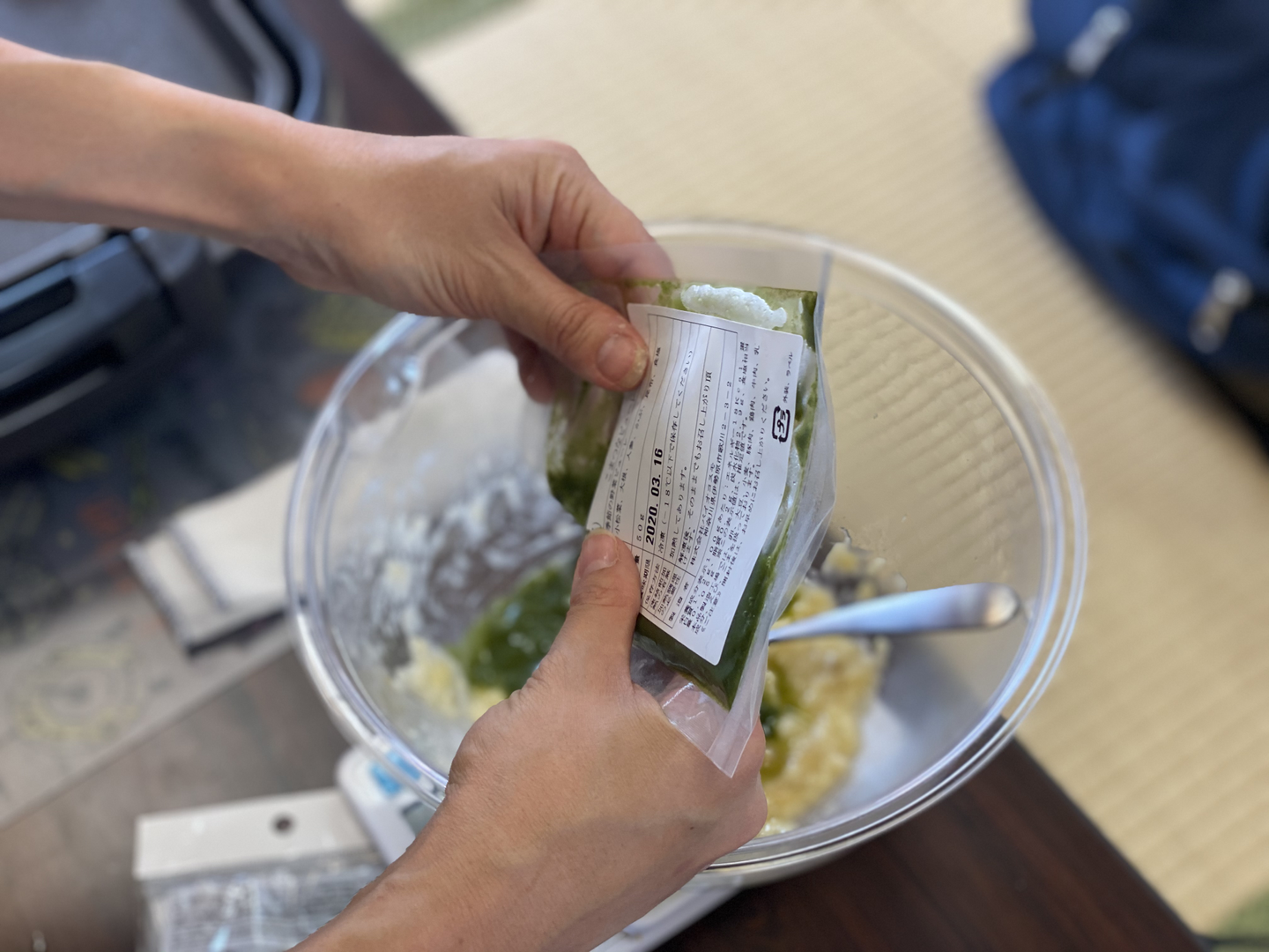 ②小松菜のピューレ、ミルクを加えて混ぜ、更に米粉を入れ混ぜ合わせる