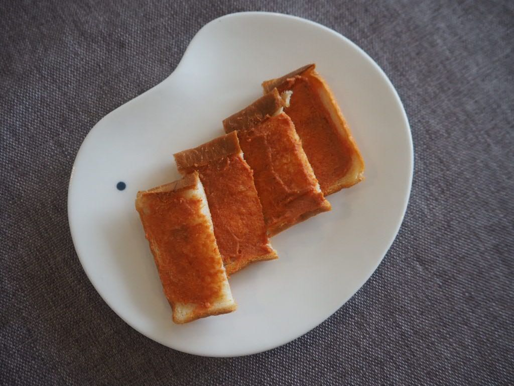 ①トマトピューレときなこを混ぜ、食べやすい大きさにカットした食パンの上にぬる