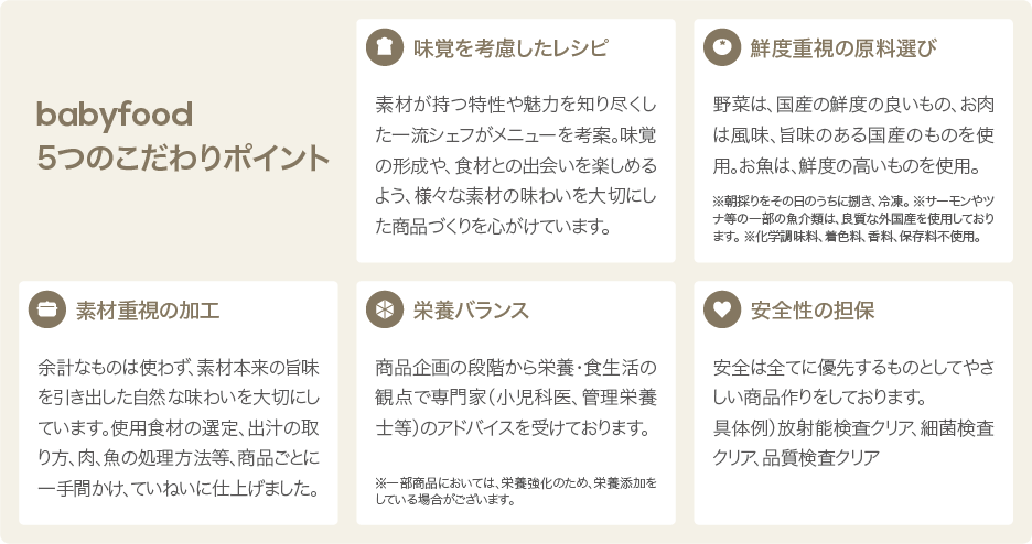 市販の離乳食は、一般のレトルト食品とは異なった独自の基準があり、赤ちゃんにあげても安全に作られています。農薬や放射線の心配もなく、食中毒の心配もなく、塩分も子どもに与えて良い分量以下であり、厳しい基準があります。