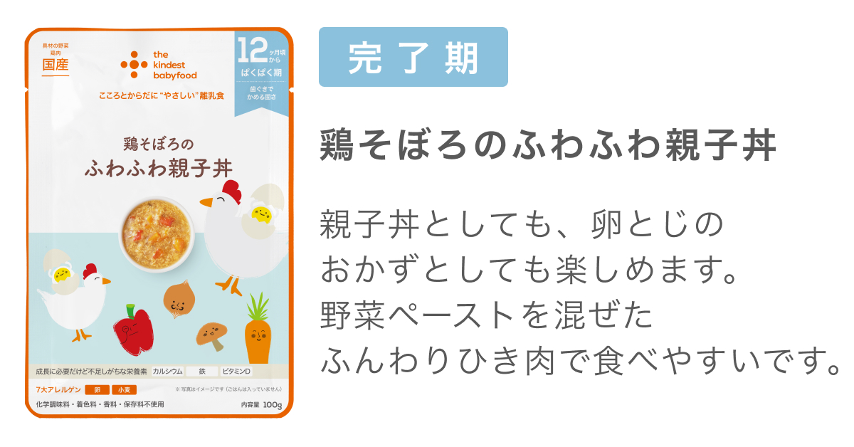 お肉は、まだ飲み込むことや噛むことを練習中のお子さまにとっては難易度の高い食材。アレルゲンである卵白や、余計な添加物を使用せずに、柔らかくおいしく仕上げられるよう試行錯誤し、細かいひき肉やそぼろのものでも、ピューレ状態にした野菜とあわせることで、より食べやすくなるよう工夫をしました。