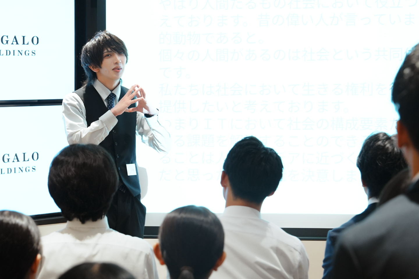 続いて行ったのは、チームに分かれての「会社紹介の発表」です。内定者は自分の所属する会社について、魅力や強みを整理し、他社の同期にわかりやすく伝えることを目的に取り組んでもらいました。自分の会社の強みを再認識するだけでなく、グループ全体としての事業内容や文化を知る貴重な機会となりました。社会人になると、ただ与えられた業務をこなすだけでなく、自分の言葉で会社の魅力を語り、周囲に発信する力が求められます。この発表体験は、まさにその第一歩!内定者のみなさんは、自分の言葉で会社の価値を伝える難しさと楽しさを体感しながら、自然と同期とのつながりを広げることができました。