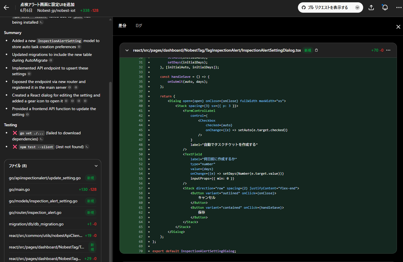 弊社のソリューションにおいて、点検結果を登録する機能とタスク管理できる機能があるが、それを連携させる、点検予定日に自動的にタスクチケットを作る機能をChatGPTのCodex AI agentに作ってもらったら、APIからDBのテーブルから何から何まで作ってもらった。