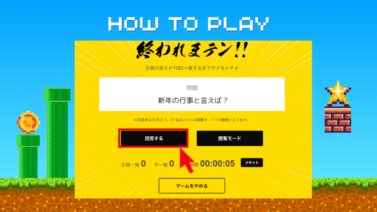 どこかで聞いたことのあるようなネーミングですが(笑)その名の通り、設問に対してチーム全員の回答を一致させ、一致数が最多のチームが優勝!という簡単なミニゲームです🎮