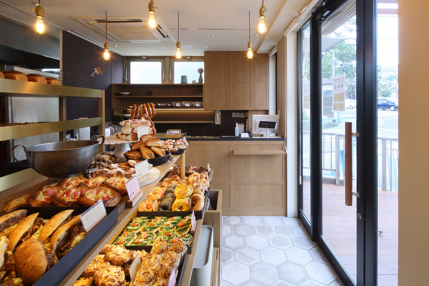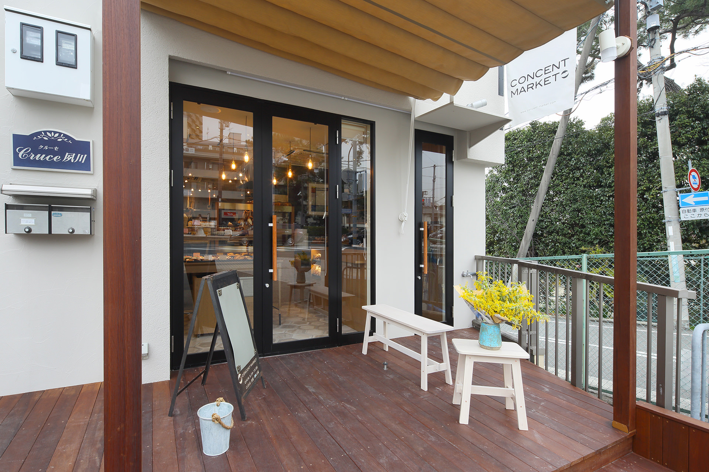 また、普段はパンの什器がテーブルに変わり、パン作り教室をできる空間に。扉を両方開ければ、デッキスペースでマルシェなどもできるよう、デッキとテントを新設。