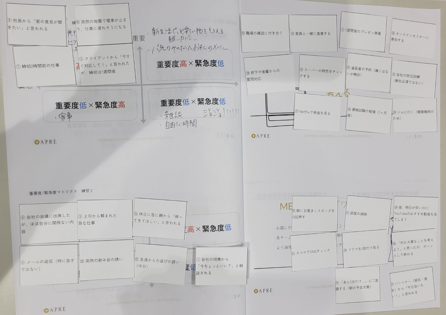 今回の座学では、社会人として仕事をするうえで意識したい、タスクを「重要度」と「緊急度」のマトリクスにわけ、カテゴリごとに優先順位をつけるというグループワークを実施してもらいました。