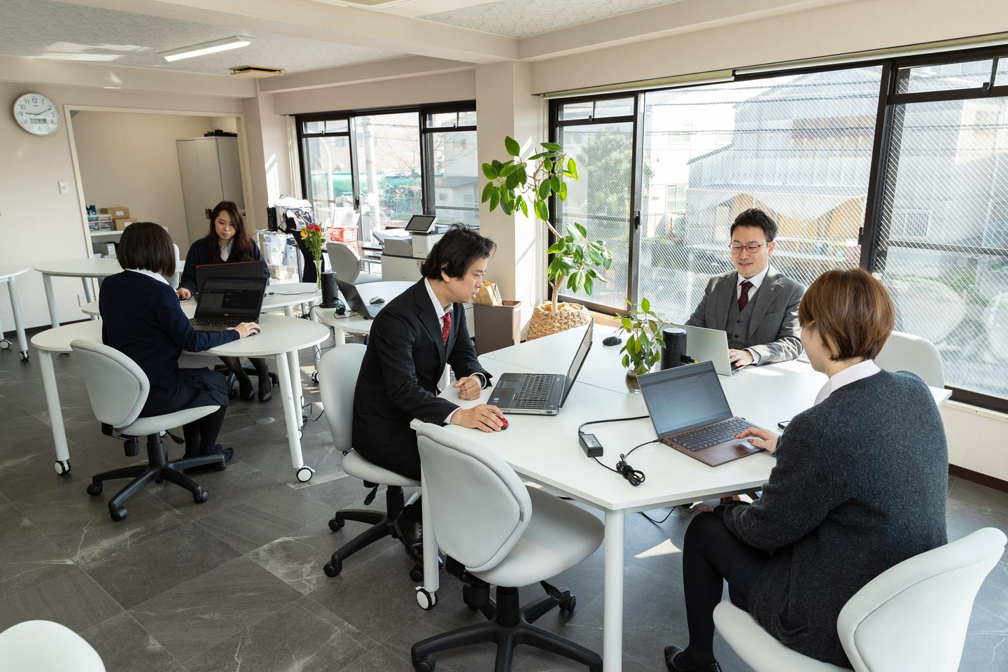 導入前は、いわゆる昭和の会社に見られるような「デスクの上に書類が積み重なり、ゴミが散らかっている」ような環境だったようですが、当時の社長がその様子を見て一念発起し、まずはデスクトップ型のパソコンを廃止。徐々に書類の整理をするなど、環境整備を進めていきました。当初は急激な環境変化に社内からも反発があったようですが、現在ではレイアウトも洗練され、フリーアドレスによりいつでも社内の好きな場所で仕事ができる環境が出来上がりました。