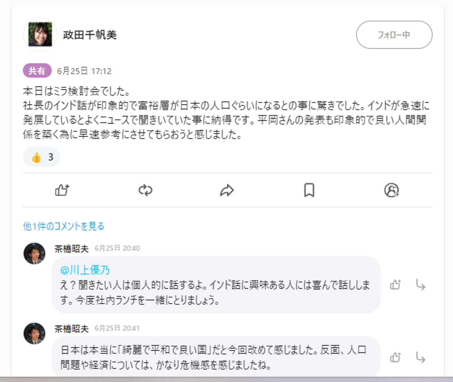 最近では、「インド進出計画」や「気付きが多くなるための日報の仕組み作り」などについて共有、提案されていました。